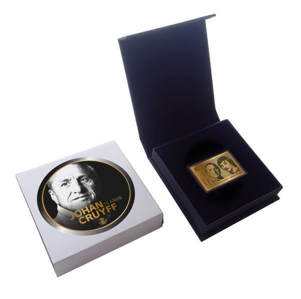 This stamp is made of 24-carat gold and was issued to commemorate the 75th anniversary of Johan Cruyff's birth. The stamp is issued by Correos, the postal service of Spain, and the edition is limited to only 1000 copies. This special gold stamp is delivered in a luxury gift box.